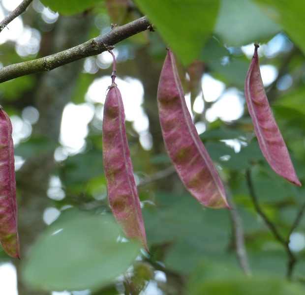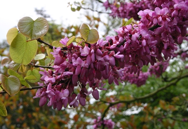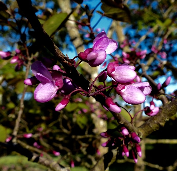 A stunning sight in May when clusters of rosy-lilac pea-like flowers wreathe the wood sometimes springing direct from mature branches and even from the trunk.