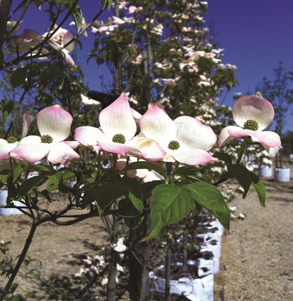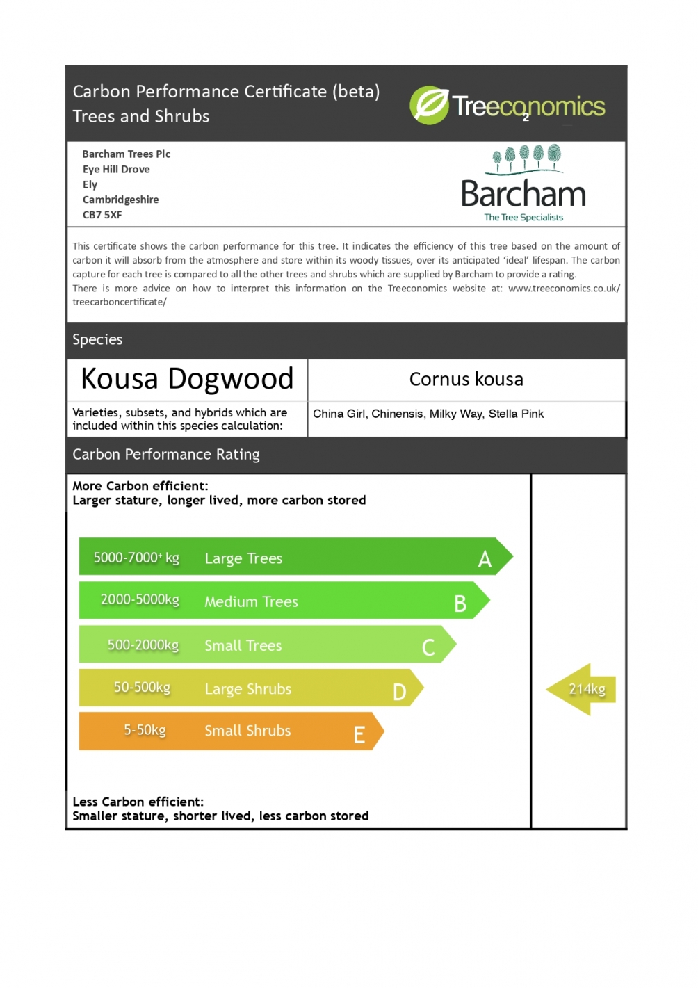 Remarkable for its pink/peach star-shaped bracts. Autumn colour is lovely with hints of orange and reds, no fruit is produced.