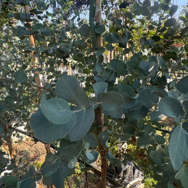 A very well-known Eucalyptus - and a very hardy one - this large, broadly pyramidal tree has smooth grey-pink to red-brown bark. The young leaves are grey-green and glaucous providing a wonderful contrast to gardens and municipal landscapes. For those florists amongst you, the foliage is particularly good to compliment cut flower arrangements.