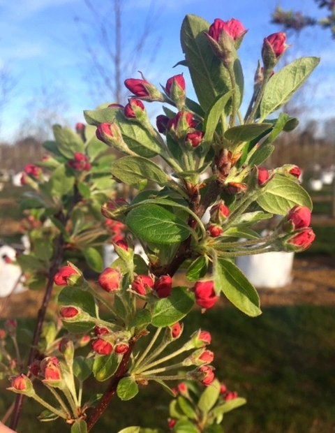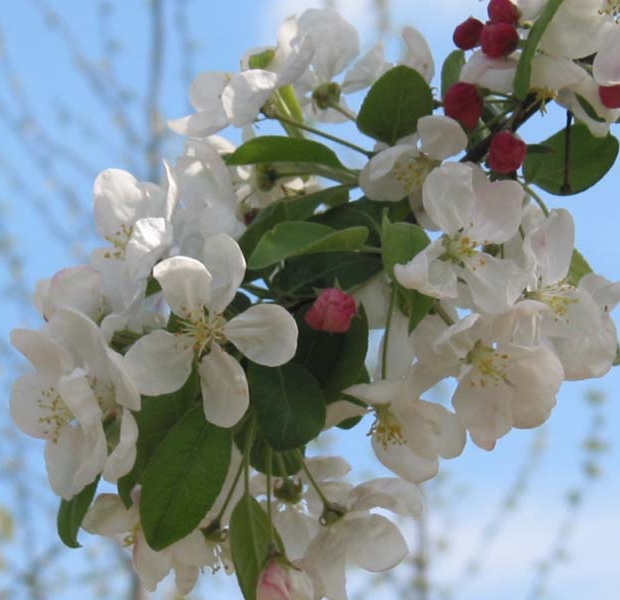 This rounded tree of medium height has flowers that are red in bud before turning white – and the blossom is borne in profusion.
