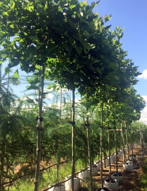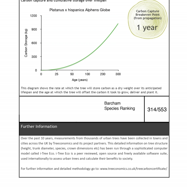 A dwarfing clone top worked onto a Platanus x hispanica stem, ideal for restricted urban areas.