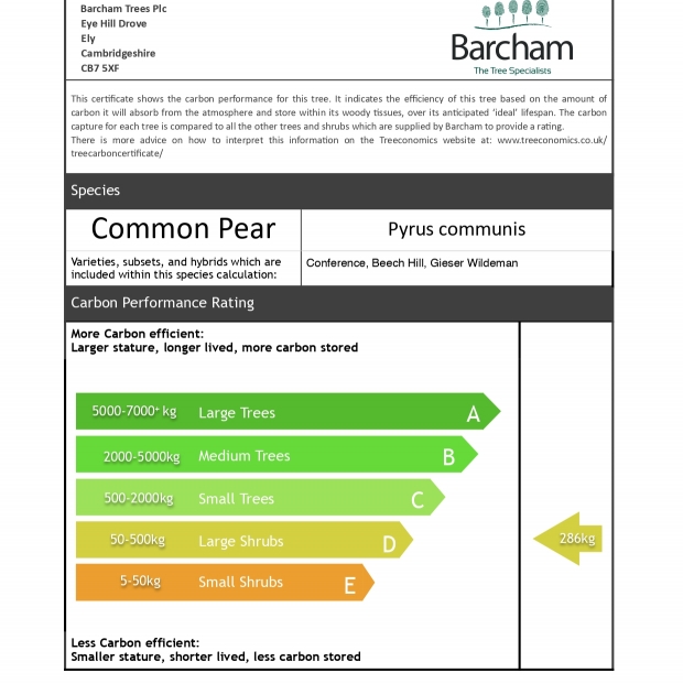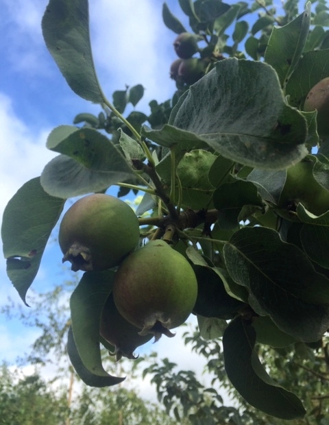 The fruit which first appear in July are ready for harvesting in September/October. The small hard green/brown pears are ideal for poaching and stewing and once boiled the flesh turns a reddish purple in colour.