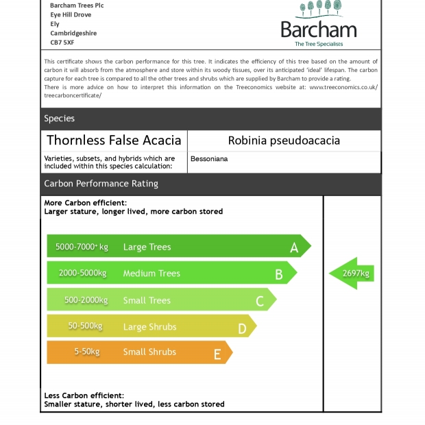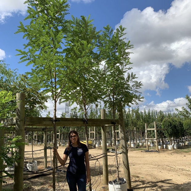 It has a compact rounded crown of virtually thorn-free branches and pale green leaves.