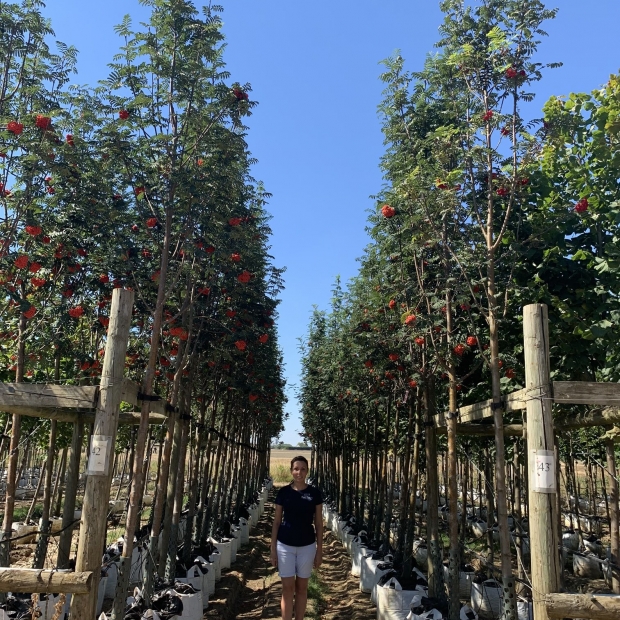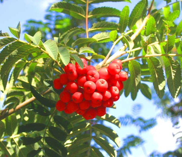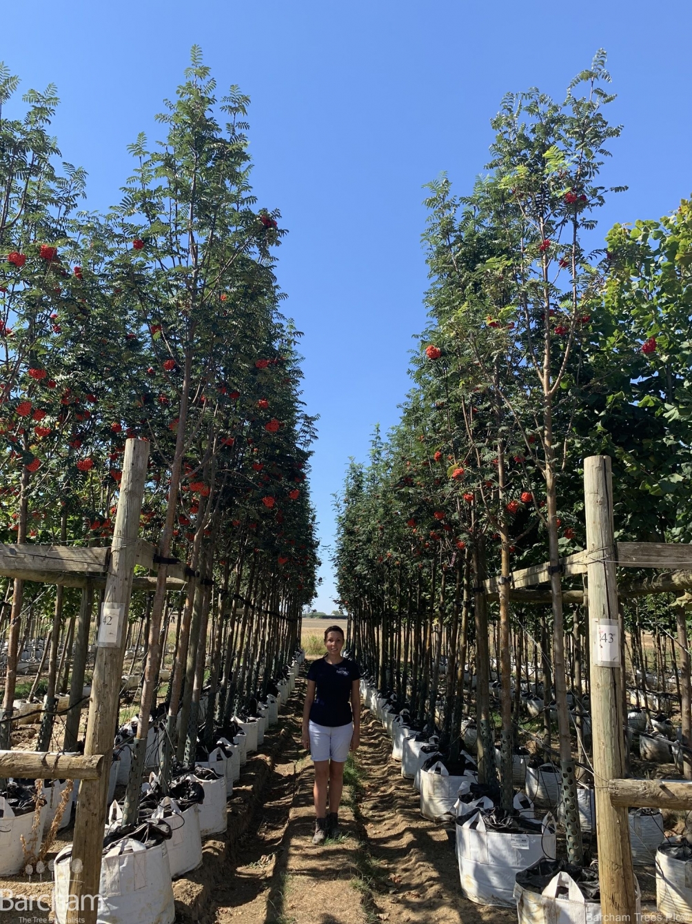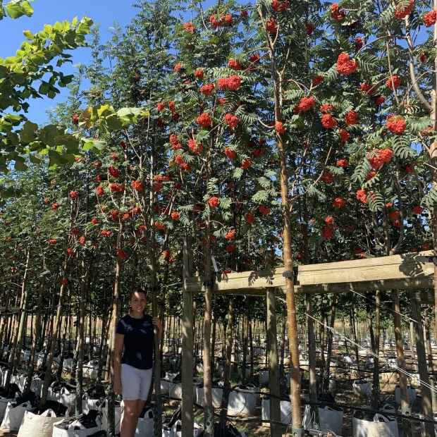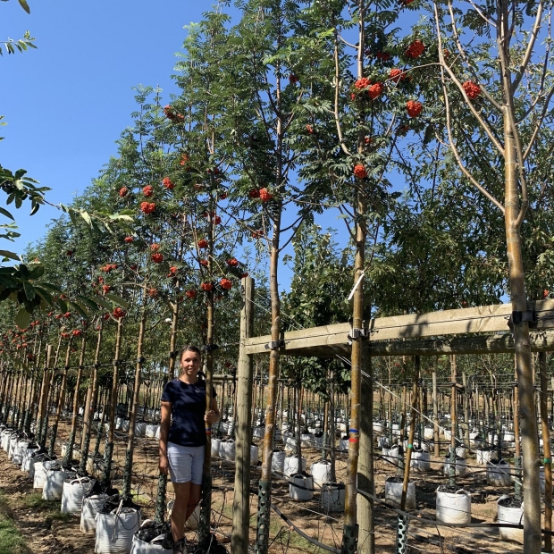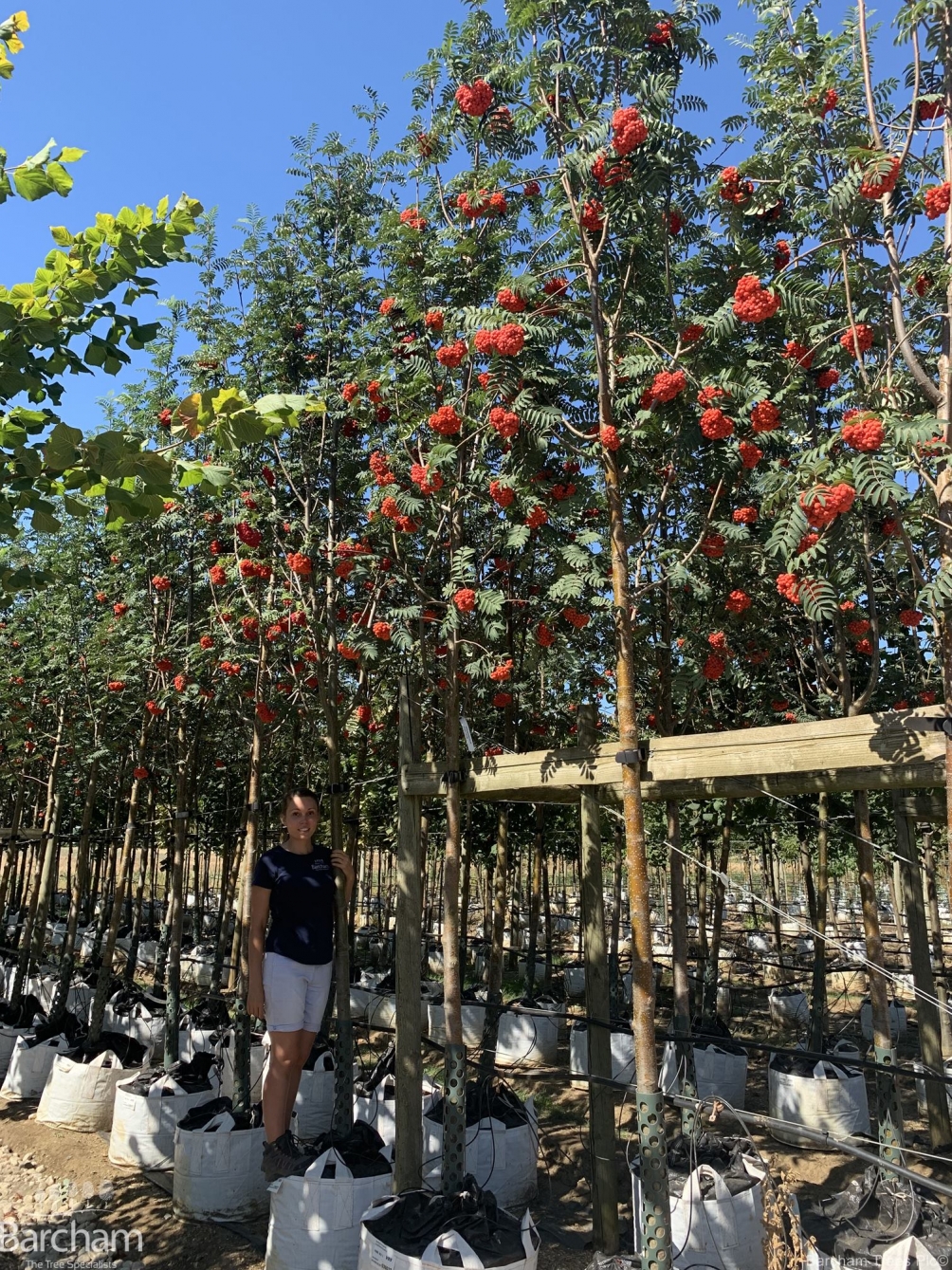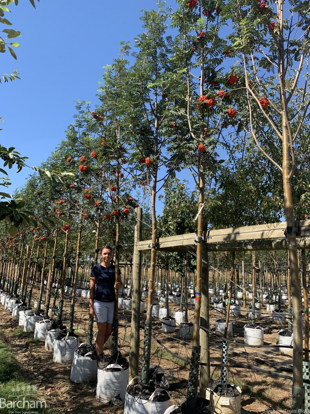 The foliage of this Mountain Ash is similar to the species, being a mid-green, compound and containing 4-9 pairs of leaflets. The flowers are creamy white and hang in clusters when they appear in the spring and are followed by bright red, bird friendly, berries in the autumn, as which point the green leaves of this reliable tree turn yellows and gold.