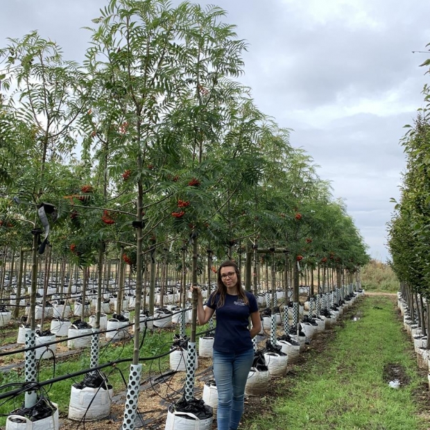 Its glossy green leaves bring freshness throughout the growing season before transforming into fiery shades of orange and red in autumn. By late summer, clusters of white spring flowers give way to rich dark-orange berries, adding seasonal interest. The young trunk is characteristically marked with decorative lenticels.