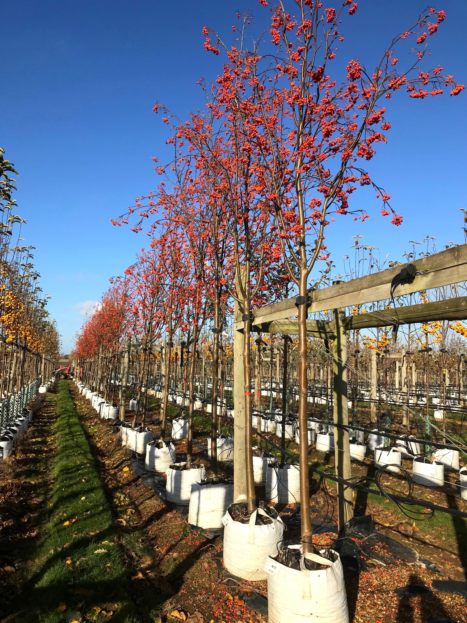 This small tree is columnar when young, but becomes broadly oval as it matures. Clusters of white flowers in spring are followed by red berries in September before vivid orange autumn colour in November.